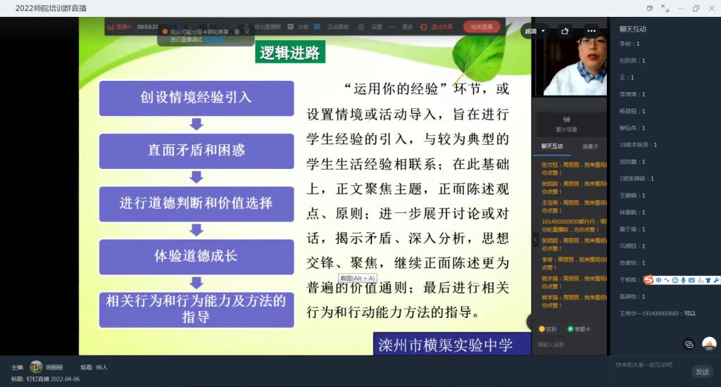 为进一步提高师范生综合素质,切实做好2022年春季学期实习工作,不断提高师范生培养质量。beat365英国官网网站于2022年4月6日上午以钉钉直播的方式举办了师范生“名师课堂”首场活动。滦州市横渠实验中学高级教师、唐山市骨干教师周丽丽老师应邀以《<道德与法治>七年级(上)教材解读》为题,为beat365英国官网网站2019级思政本科和2020级、2021级公费师范生作了报告。beat365英国官网网站胡志洋老师主持活动。