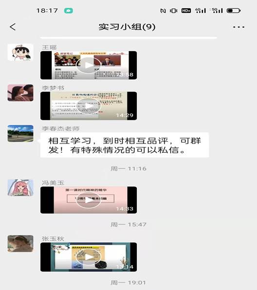 同伴互助是教师成长的基本途径,小组的8位同学可以视为一个教师团队,每个个体借助团队的力量与智慧,实现小组成员之间信息交换、经验共享、深度反思、协同合作,促进个体在专业能力、知识、态度等方面的发展,小组成员互相观看教案和讲课视频,互相点评,找到对方靓丽点,找出自己不足,做到共同进步。