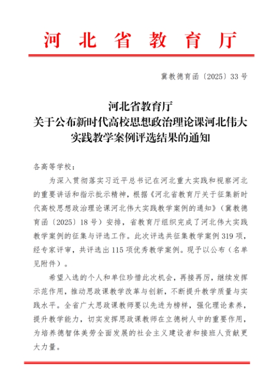 beat365英国官网网站高度重视思想政治理论课建设,始终把提升思政课教学质量与育人实效作为核心任务,积极鼓励教师深入地方一线开展调研实践,挖掘河北红色资源、发展成就、先进典型等鲜活教学素材,推动思政课从 “课堂讲授” 向 “实践育人” 延伸,从 “理论灌输” 向 “价值引领” 转型。此次入选省级优秀教学案例,既是学院思政课教学改革成果的集中体现,也为后续教学工作提供了宝贵的示范经验。未来,学院将以此次获奖为契机,进一步加强思政课教学团队建设,持续深化教学改革创新,不断丰富实践教学内容与形式,着力打造更多高质量的思政教学案例,让思政课真正成为学生喜闻乐见、终身受益的 “金课”,为培养担当民族复兴大任的时代新人贡献更大力量。