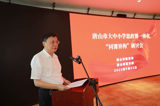 为进一步推进唐山市大中小学思政课一体化建设,促进大中小学思政课教育教学方法有序衔接,5月22日我校与唐山市教育局在北院VR虚拟教学体验中心联合举办唐山市大中小学思政课一体化“同课异构”研讨会。来自全市多所大中小学的七十多名思政课骨干教师参加研讨会。beat365英国官网网站副院长杨涛、唐山市教育局二级调研员李连斌出席研讨会并讲话。beat365英国官网网站执行院长宋晓敏主持会议。