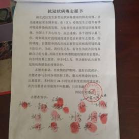 为了打赢这场没有硝烟的战争,响应村里号召,我报名做了一名防疫志愿者,我的工作是每天在防疫工作站登记来往车辆的相关信息。在我工作期间,每天都有志愿者来报名,广大村民也在捐钱捐物,希望为防疫工作出一份力。在防疫工作中,党员领导干部都冲在最前线,统计信息,走访排查,值班到深夜,让我看到了作为一名党员的责任与担当。国家育我二十载,我许国家以深情。就像毛爷爷说的那样:“敌军围困万千重,我自岿然不动。早已森严壁垒,更加众志成城。”