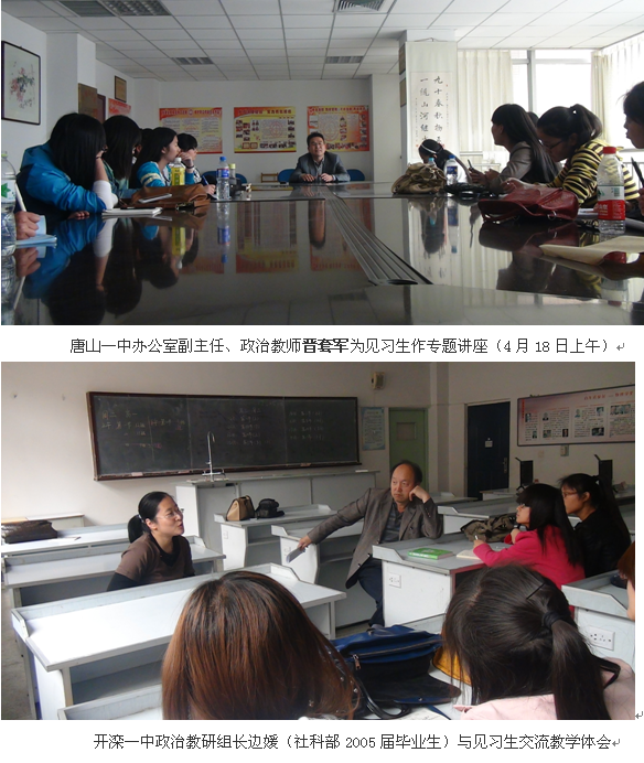 年4月14—25日,社科部2012级思想政治教育本科班和专接本班92名学生,在社科部主任吴文华、副主任白臣副教授和社科部教师培训中心主任马千喜带领下,在唐山一中、开滦一中、唐山十中、南厂小学等学校开展教育见习。4月11日上午,马千喜老师对见习生进行见习指导,对见习目的、内容、方法,以及见习生守则作了详细说明,特别强调了见习生的人身安全、饮食安全和财务安全。见习期间,见习生观摩课堂教学、集体备课,课后进行评课;邀请优秀教师晋套军、边媛举办教学经验专题讲座。见习生就“中学生学习能力”等进行了专题调查,撰写了调研报告。在南厂小学见习的汪艳影、秦莹、于淼、侯朋庆在导师指导下每人上了一节课。返校后,见习生每人完成“评课稿”、“调研报告”和“见习总结”等作业。通过教育见习,见习生既体验了中学教师工作的苦与乐,又提升了教师教育教学技能。(马千喜)