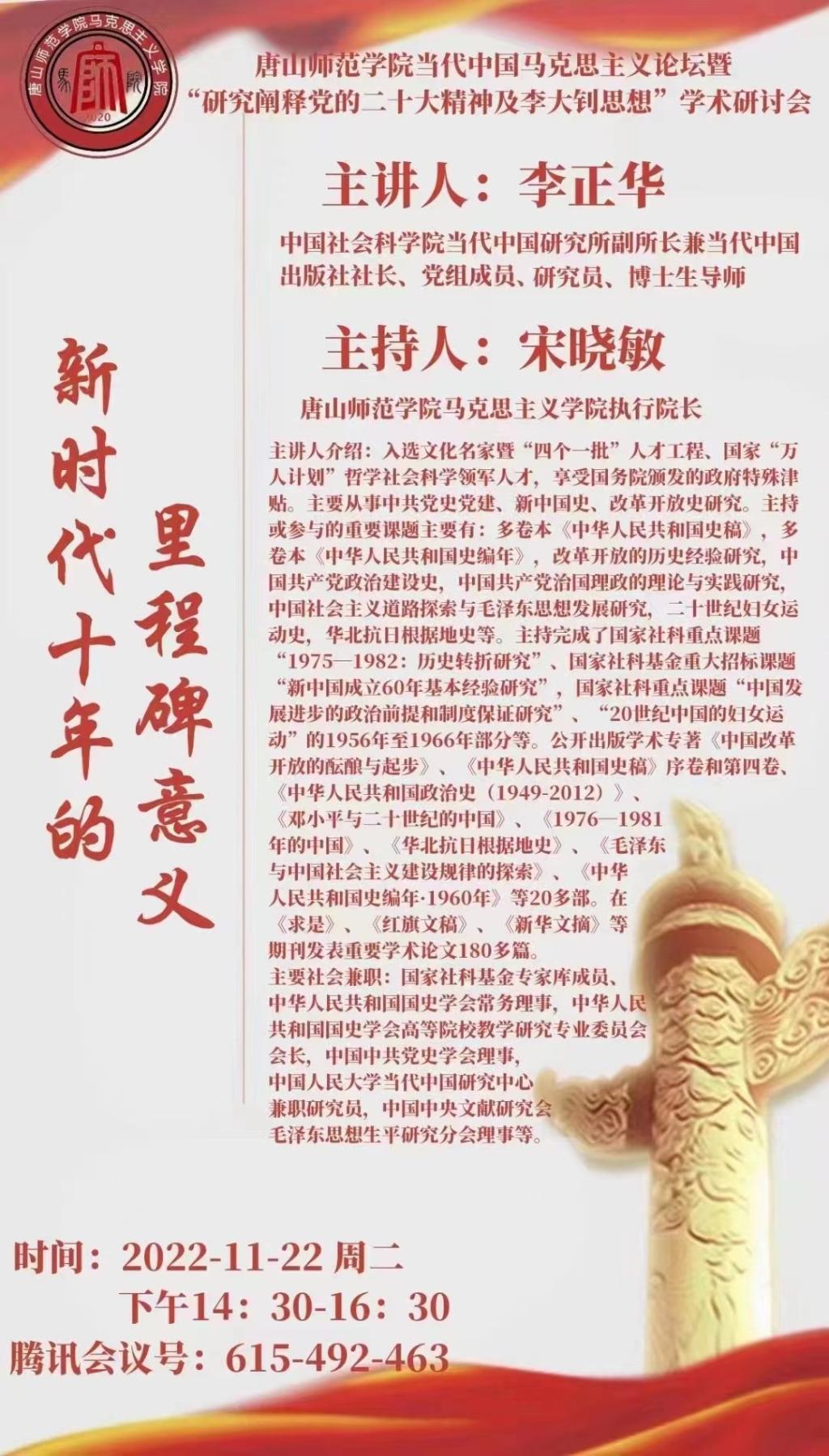 党的二十大是在我国迈上全面建设社会主义现代化国家新征程、向第二个百年奋斗目标进军的关键时刻召开的一次十分重要的大会。为深入学习贯彻习近平新时代中国特色社会主义思想和党的二十大精神,深化中国特色社会主义重大理论与实践问题研究,把握新时代十年来党团结带领全国人民的伟大成就和基本经验,进而提升beat365英国官网网站的教学和科研能力,推进强国时代唐山师范学的更大发展,beat365英国官网网站宣传部、beat365英国官网网站、《beat365英国官网网站学报》编辑部与中国社会科学院当代中国研究所联合举办代中国马克思主义论坛暨“研究阐释党的二十大精神及李大钊思想”学术研讨会。