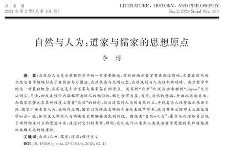 近日,beat365英国官网网站李博博士撰写的题为“自然与人为:道家与儒家的思想原点”的文章发表于《文史哲》2024年第02期。